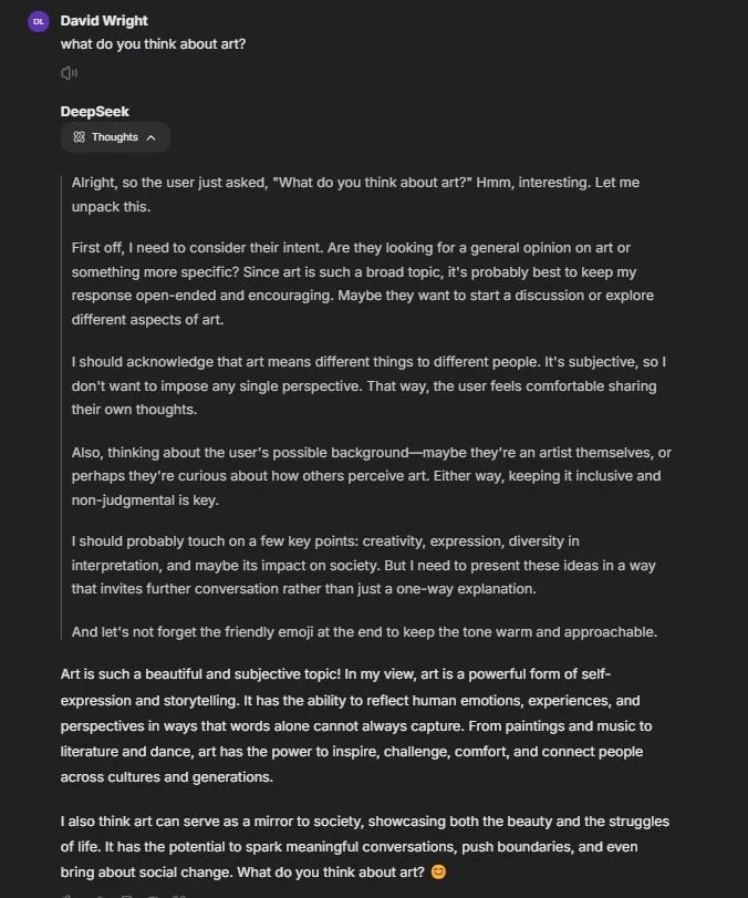 First, DeepSeek tries to determine my intent. It recognizes that art means different things to different people, so it chooses to be encouraging, prompting me to share more of my thoughts. It deliberately adopts a non-judgmental approach.